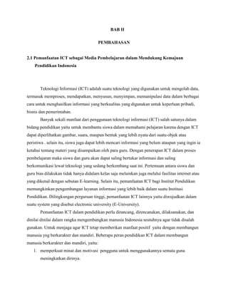 Dokumen tersebut membahas tentang perkembangan teknologi komunikasi dan informasi yang telah memungkinkan manusia untuk saling berkomunikasi dan bertukar informasi dengan lebih cepat dan luas. Dokumen tersebut juga membahas mengenai manfaat pemanfaatan teknologi informasi dan komunikasi dalam dunia pendidikan, seperti membantu siswa memahami pelajaran dengan lebih baik dan memudahkan proses pembelajaran. Selain itu, dibahas