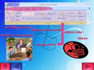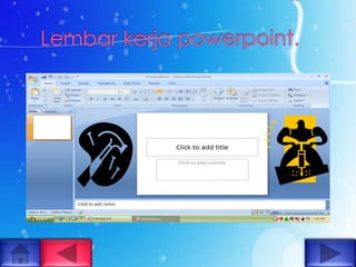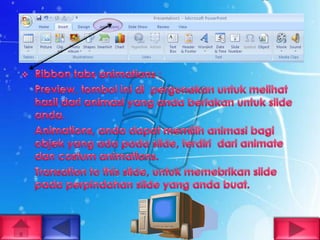 Dokumen ini membahas tentang penggunaan Microsoft PowerPoint 2007, termasuk cara membuka aplikasi, fungsi-fungsi utama, dan fitur dari ribbon tabs. Pengguna dapat mengakses berbagai alat untuk membuat presentasi yang menarik, seperti menambahkan teks, gambar, grafik, dan mengatur desain slide. Selain itu, terdapat informasi tentang menyimpan dan menutup presentasi serta pertanyaan latihan terkait penggunaan PowerPoint.