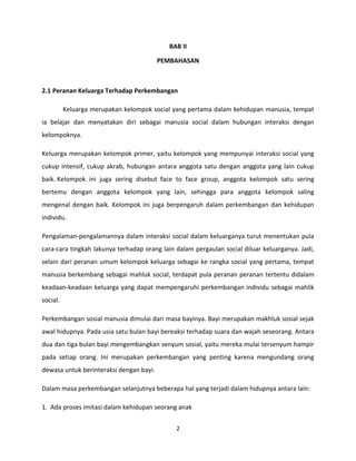 Dokumen tersebut membahas pengaruh lingkungan sosial seperti keluarga, sekolah, lingkungan kerja, dan media massa terhadap perkembangan individu. Keluarga dijelaskan sebagai lingkungan sosial primer yang mempengaruhi perkembangan sosial sejak awal. Peranan sekolah lebih luas dari pendidikan formal dan mencakup pembentukan sikap. Lingkungan kerja di perusahaan besar dan pertanian mempengaruhi kepribadian. Pengar
