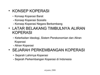 Dokumen ini membahas konsep, aliran, dan sejarah koperasi, dengan penekanan pada perbedaan antara koperasi barat, sosialis, dan negara berkembang. Koperasi berfungsi sebagai organisasi yang menguntungkan anggota dengan saling membantu dan mendukung ekonomi anggota, serta memiliki dampak positif dan negatif terhadap sosioekonomi. Sejarah perkembangan koperasi di dunia dan di Indonesia juga dijabarkan, dari lahirnya koperasi modern pada tahun 1844 hingga perkembangan legislatif dan organisasi koperasi di Indonesia.