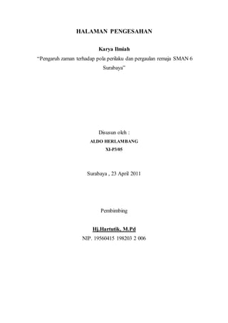 Karya ilmiah ini membahas pengaruh zaman terhadap pola perilaku dan pergaulan remaja khususnya siswa SMAN 6 Surabaya. Perkembangan teknologi dan masuknya budaya Barat berdampak pada gaya hidup remaja yang kurang memperhatikan nilai-nilai budaya Indonesia dan agama. Hal ini dapat menyebabkan perilaku menyimpang seperti seks bebas. Orang tua perlu membimbing anak agar tidak terjerumus ke dalam hal-hal negatif ak