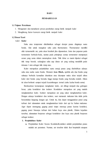 Dokumen tersebut membahas tentang percobaan pengukuran konversi energi listrik menjadi kalor menggunakan kalorimeter. Pada percobaan ini, arus listrik dialirkan ke dalam air dalam kalorimeter dan kenaikan suhunya diukur. Data percobaan seperti arus, tegangan, dan waktu diukur untuk menghitung faktor konversi energi listrik menjadi kalor."