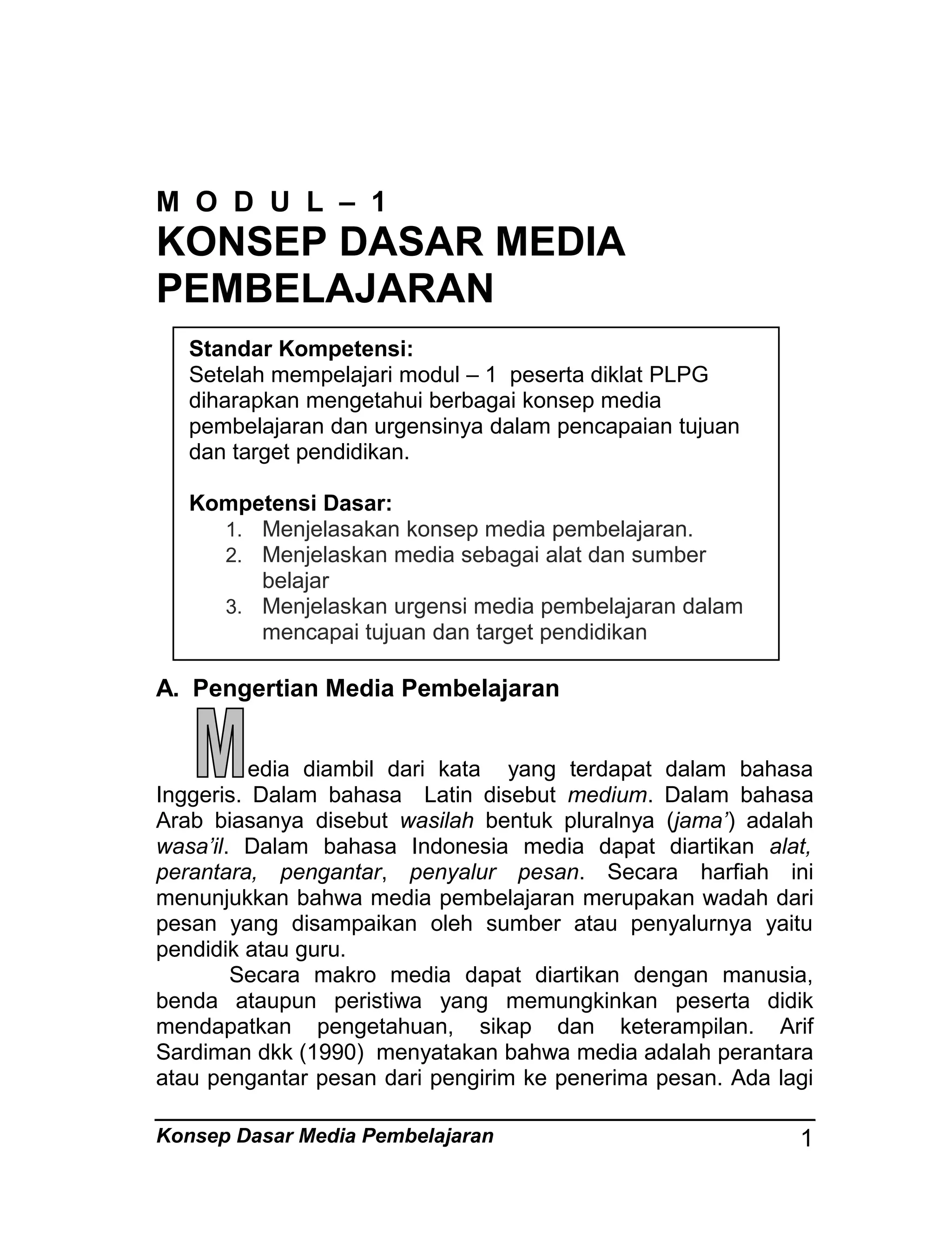 Dokumen ini membahas konsep dasar media pembelajaran dan urgensinya dalam pendidikan. Media pembelajaran diartikan sebagai alat dan sumber belajar yang penting untuk mencapai tujuan pendidikan dan standar kompetensi. Penggunaan media yang tepat dapat meningkatkan keterlibatan, kreativitas, dan efektivitas belajar peserta didik.
