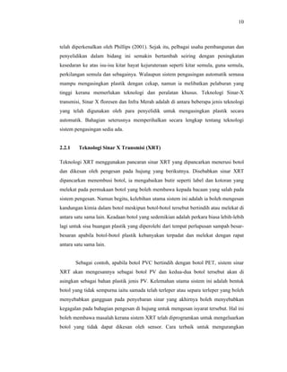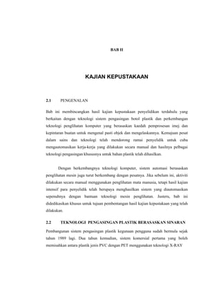 Bab ini membahas kajian mengenai teknologi pengasingan botol plastik menggunakan pemprosesan imej dan kecerdasan buatan. Beberapa teknologi yang dibincangkan termasuk sinar-X, sinar-X floresen, dan infra merah, serta aplikasi sistem penglihatan mesin dalam pengasingan sisa pepejal. Kesimpulannya, banyak kemajuan telah dicapai dalam bidang tersebut, meskipun terdapat cabaran dalam pengesanan dan pengkelasan botol plastik.