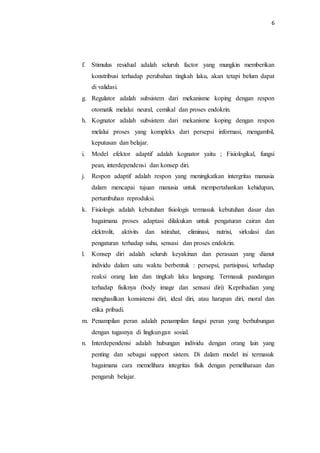 Tinjauan pustaka mendiskusikan Model Adaptasi Roy yang melihat manusia sebagai sistem adaptasi. Model ini menjelaskan empat mode adaptasi (fisiologis, konsep diri, peran, dan interdependensi) dan bagaimana stimulus lingkungan dapat memengaruhi kemampuan adaptasi seseorang. Teori ini bertujuan membantu manusia dalam menyesuaikan diri terhadap perubahan kebutuhan selama sehat atau sakit.
