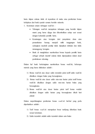 Al-wadi’ah adalah titipan murni yang diterima dan harus dijaga serta dikembalikan oleh penerima titipan, dengan hukum yang diatur dalam Islam. Ada dua jenis wadi’ah dalam perbankan syariah: wadi’ah yad al-amanah (tidak dapat dimanfaatkan) dan wadi’ah yad adh-dhamanah (dapat dimanfaatkan). Dalam bank syariah, keuntungan tidak dapat dijanjikan, tetapi bank dapat memberikan bonus sebagai penghargaan kepada pemilik titipan.