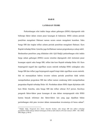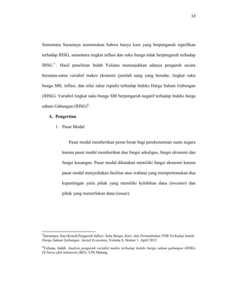 Indeks Harga Saham Gabungan (IHSG) di Indonesia dipengaruhi oleh suku bunga SBI, inflasi, dan kurs rupiah terhadap dolar AS, dengan kurs memiliki dampak negatif yang signifikan. Penelitian menunjukkan bahwa investor cenderung lebih memperhatikan pergerakan kurs daripada suku bunga dan inflasi selama periode penelitian, yang mencerminkan kecilnya pengaruh faktor-faktor tersebut terhadap IHSG. Pasar modal Indonesia, sebagai emerging market, memiliki karakteristik dan tantangan tertentu, termasuk pengaruh besar dana asing dan pengawasan yang lemah.