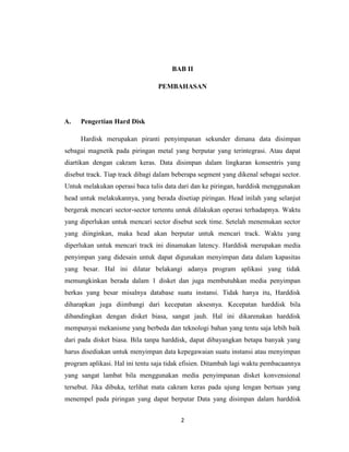 Hard disk adalah perangkat penyimpanan data internal yang menyimpan data secara magnetik pada piringan logam berputar. Hard disk berfungsi untuk menyimpan data dalam kapasitas besar dan kecepatan akses yang lebih tinggi dibandingkan media penyimpanan lain. Terdapat dua jenis antarmuka hard disk, yaitu IDE dan SATA.