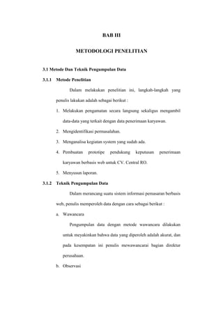 Dokumen tersebut membahas metodologi penelitian yang digunakan, yaitu metode pengamatan, wawancara, dan studi kepustakaan untuk mengumpulkan data. Jadwal penelitian meliputi studi kepustakaan, penulisan proposal, pengumpulan data, pembuatan sistem, pengujian, dan penulisan laporan.