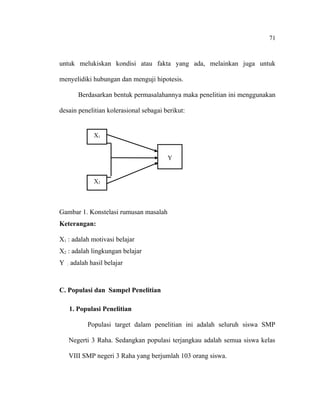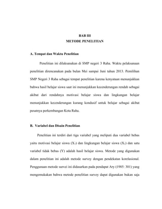 Dokumen tersebut merupakan bagian metode penelitian yang menjelaskan tentang tempat dan waktu penelitian, variabel penelitian, desain penelitian, populasi dan sampel, teknik pengumpulan data, instrumen penelitian, dan teknik analisis data. Penelitian ini dilaksanakan di SMP Negeri 3 Raha pada bulan Mei-Juni 2013 untuk mengetahui hubungan antara motivasi belajar, lingkungan belajar, dan hasil belajar siswa