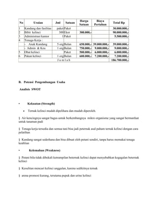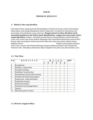 Dokumen tersebut merupakan rencana program kegiatan peternakan kelinci yang mencakup (1) bidang usaha peternakan kelinci, (2) analisis SWOT usaha peternakan kelinci, dan (3) proyeksi pendapatan dan kelayakan usaha peternakan kelinci. Program ini bertujuan meningkatkan produksi kotoran kelinci untuk pupuk organik dan menghasilkan keuntungan.