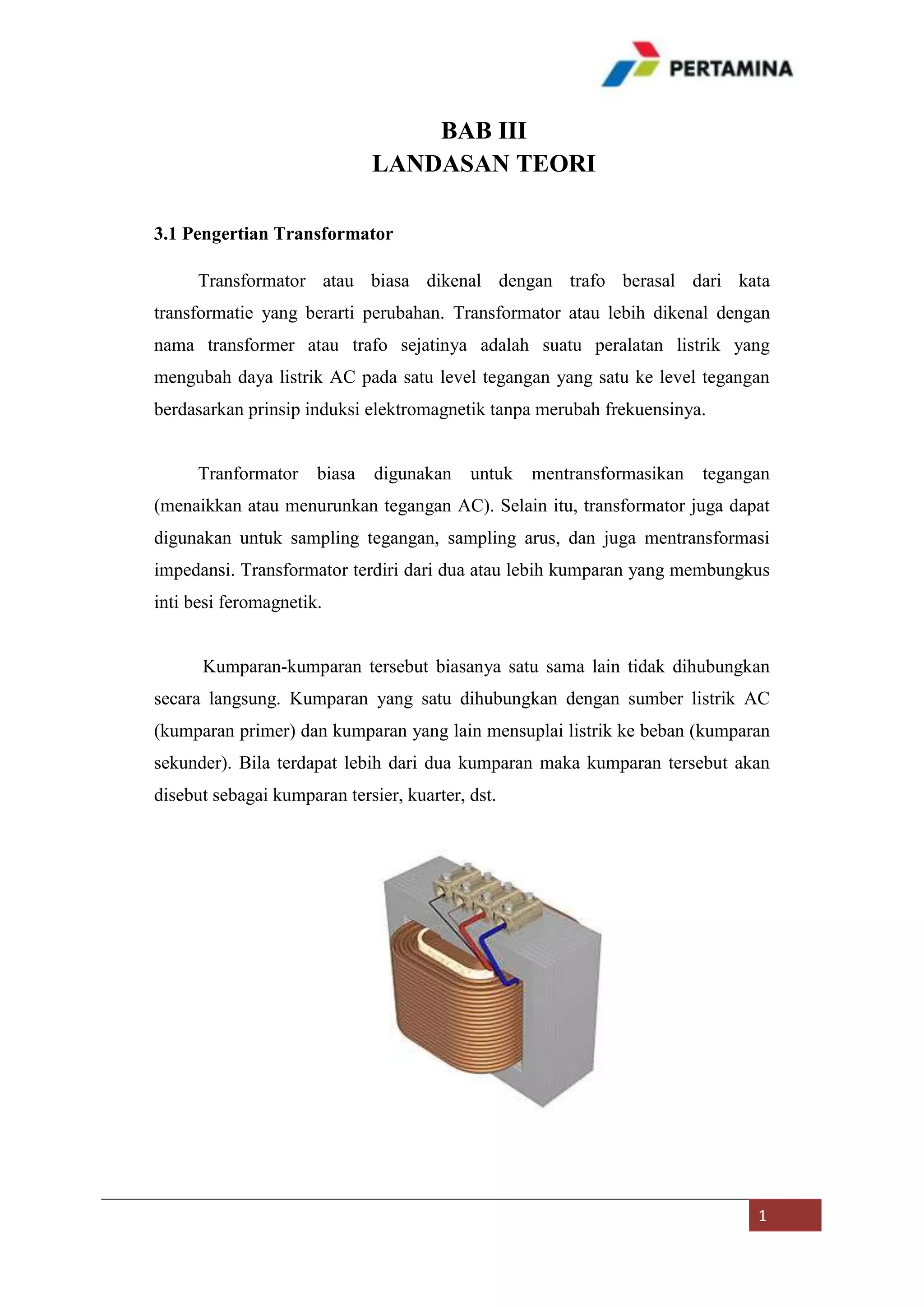 Transformator adalah alat listrik yang mengubah level tegangan daya listrik AC berdasarkan prinsip induksi elektromagnetik tanpa merubah frekuensinya. Terdiri dari kumparan primer dan sekunder yang berfungsi untuk menaikkan atau menurunkan tegangan serta tipe-tipe tertentu seperti transformator daya, distribusi, dan pengukuran. Konstruksi dan komponennya dirancang untuk efisiensi dan perlindungan, serta termasuk sistem pendingin dan peralatan proteksi untuk menghindari kerusakan.
