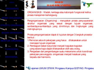 Dokumen tersebut membahas tentang organisasi dan struktur organisasi perusahaan. Terdapat dua aspek utama penyusunan struktur organisasi yaitu departementalisasi dan pembagian kerja. Struktur organisasi dapat berbentuk fungsional atau divisional, tergantung pada strategi dan ukuran perusahaan.
