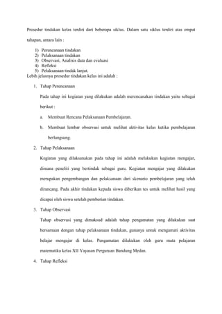 Penelitian ini bertujuan untuk meningkatkan hasil belajar siswa kelas XII SMK 1 Yayasan Perguruan Bandung Medan pada materi polinomial melalui model olimpiade matematika. Metode yang digunakan adalah penelitian tindakan kelas dengan prosedur yang meliputi perencanaan, pelaksanaan, observasi, analisis data, dan refleksi. Hasil analisis menunjukkan bahwa siklus tindakan yang diterapkan berhasil meningkatkan pemahaman siswa terhadap materi polinomial.
