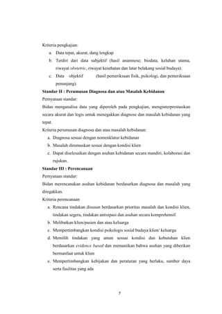 Dokumen tersebut membahas tentang asuhan kebidanan dan kehamilan. Secara khusus membahas tentang standar asuhan kebidanan menurut keputusan menteri kesehatan dan perubahan fisiologi yang terjadi pada ibu hamil seperti pada rahim, payudara, sistem endokrin, dan lainnya. Dokumen ini memberikan panduan dasar untuk mengenali kondisi normal dan patologis selama kehamilan guna memberikan asuhan yang tepat.