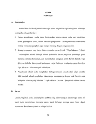 Bab IV merangkum kesimpulan dan saran dari dokumen tersebut. Kesimpulannya adalah bahwa pengelolaan usaha harus direncanakan dengan baik, strategi pemasaran yang tepat penting untuk bersaing, dan kendala dapat diatasi dengan baik. Saran yang diberikan adalah merencanakan usaha secara matang, memilih strategi pemasaran yang tepat, dan tetap semangat menghadapi tantangan.