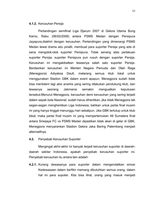Dokumen tersebut membahas tentang peristiwa kerusuhan suporter sepak bola di Indonesia, penyebabnya, dan dampaknya. Beberapa penyebab utama kerusuhan suporter adalah kurang dewasanya para suporter, fanatisme berlebihan, dan kurangnya pengamanan. Dampak negatifnya meliputi korban jiwa, citra sepak bola Indonesia yang memburuk, rusaknya fasilitas stadion, serta terancamnya keselamatan pemain.