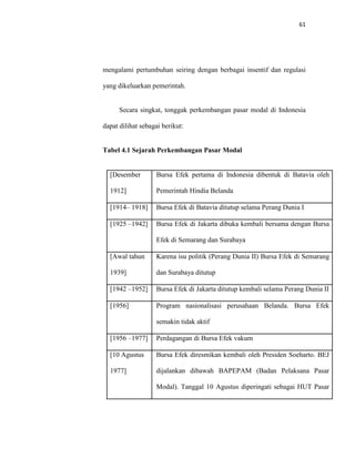 Dokumen ini memberikan gambaran sejarah bursa efek Indonesia, dimulai dari pendirian awal pada tahun 1912 dan berbagai tantangan yang dihadapinya hingga pemulihan dan perkembangan pasar modal setelah 1977. Bursa Efek Indonesia (BEI) memiliki visi untuk menjadi bursa yang kompetitif dengan kredibilitas tingkat dunia dan fokus pada pemberdayaan investor serta emiten. Selain itu, saham sebagai instrumen investasi dijelaskan melalui keuntungan dari dividen dan capital gain, serta risiko yang dapat dihadapi oleh pemegang saham.