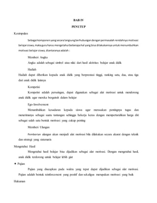 Dokumen ini membahas pentingnya motivasi belajar siswa dan beberapa strategi yang dapat digunakan guru untuk menumbuhkannya, seperti pemberian angka, hadiah, kompetisi, pujian, dan ulangan. Setiap siswa memiliki kebutuhan motivasi yang berbeda, sehingga guru diharapkan dapat memahami dan menjaga motivasi anak didiknya. Selain itu, dokumen ini juga mencantumkan referensi terkait pendidikan dan psikologi belajar.