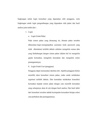 Sistem pakar kerusakan Blackberry berbasis web dibangun untuk membantu pengguna awam menganalisis masalah pada perangkat Blackberry dengan memilih gejala yang tersedia. Sistem terdiri dari login untuk konsultasi pengguna dan login untuk pengembangan oleh pakar, serta hasil analisis masalah dan solusi yang direkomendasikan. Pengetahuan diperoleh dari wawancara dengan pakar teknisi mengenai gejala kerusakan, jenis masalah, dan