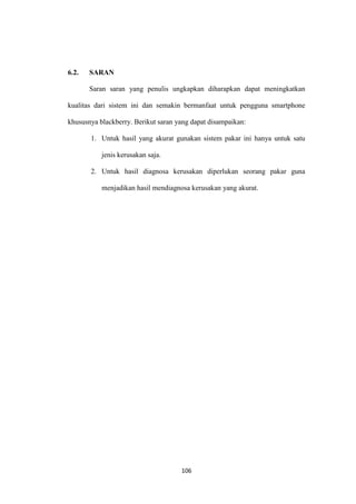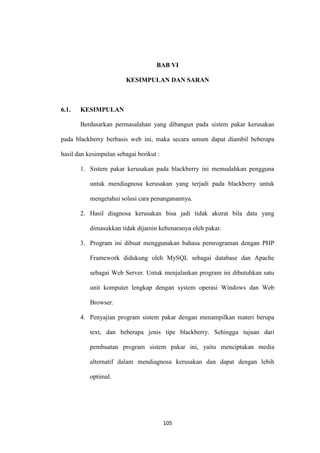 Bab VI berisi kesimpulan dan saran dari sistem pakar kerusakan blackberry berbasis web. Sistem ini dapat memudahkan pengguna mendiagnosa masalah blackberry dan menentukan solusi. Namun, hasil diagnosa tidak selalu akurat tanpa konfirmasi dari pakar. Program dibuat menggunakan PHP dan MySQL untuk menyimpan dan mengakses data. Tujuannya adalah menciptakan alternatif baru untuk mendiagnosa kerusakan blackberry. Sar