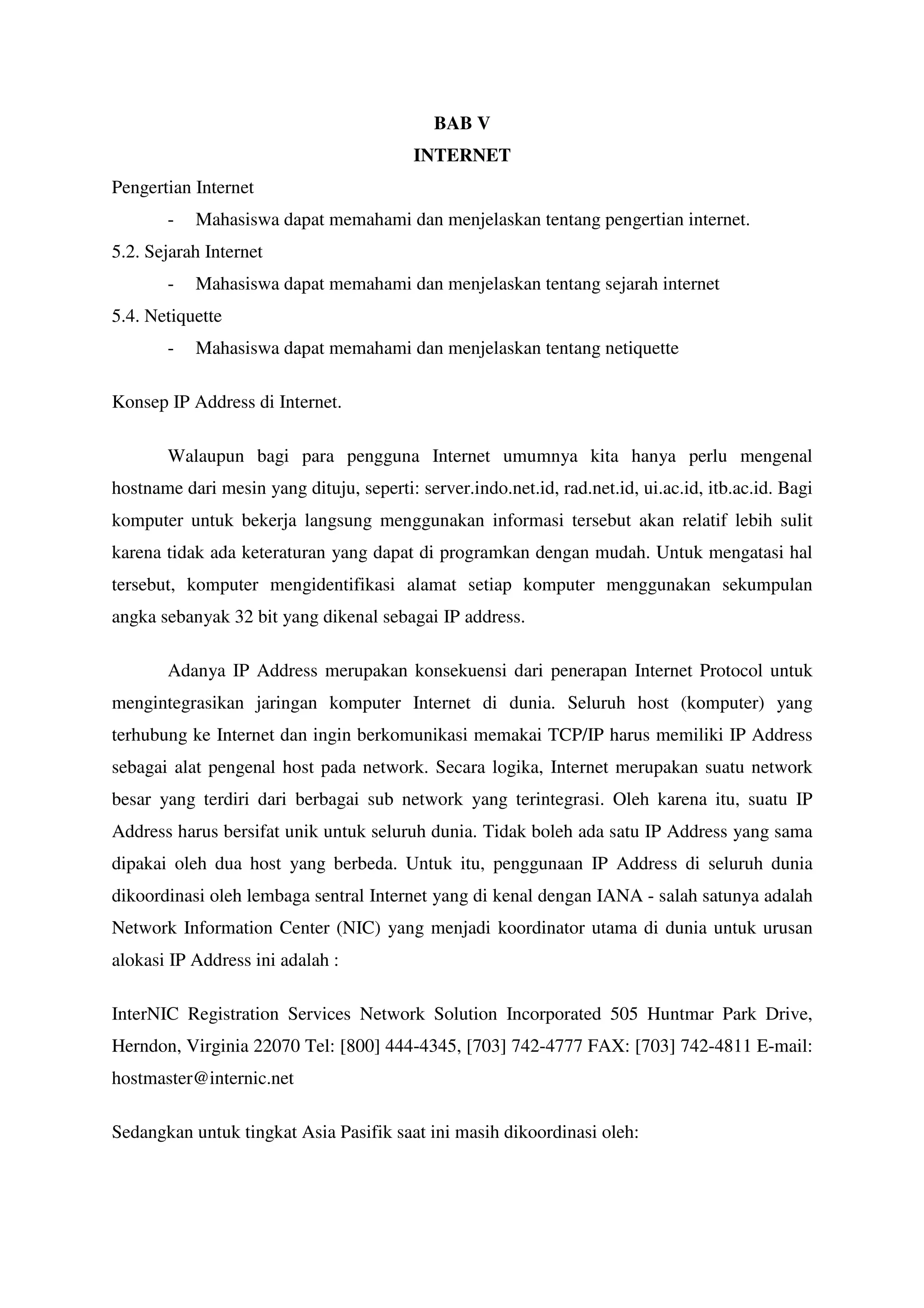 Dokumen tersebut membahas tentang konsep IP Address di Internet. IP Address terdiri dari 32 bit yang dibagi menjadi 4 segmen dan masing-masing segmen berisi 8 bit. IP Address dibedakan menjadi beberapa kelas berdasarkan bit pertama, yaitu kelas A, B, C, D dan E. Setiap kelas memiliki cara tersendiri untuk membagi antara bit jaringan dan bit host. IP Address juga memiliki fungsi khusus seperti address jaringan, address siar dan netmask.