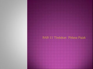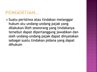 Dokumen tersebut membahas tentang tindak pidana pajak dan proses penyidikan serta penuntutannya menurut undang-undang perpajakan Indonesia. Termasuk pengertian penyidikan tindak pidana pajak, wewenang penyidik pajak, sistem pembuktian, dan penuntutan ke pengadilan untuk mendapatkan putusan hukum.