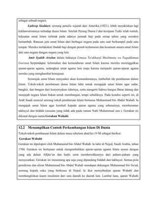 Dokumen ini membahas perkembangan Islam di dunia, mencakup kebangkitan umat Islam di bawah penjajahan Barat dan munculnya tokoh-tokoh reformis seperti Muhammad bin Abdul Wahab dan Jamaluddin Al-Afghani yang berjuang untuk kembali kepada ajaran Islam yang murni serta memperjuangkan persatuan umat Islam. Kebangkitan ini diwarnai dengan gerakan pembaruan dan penentangan terhadap berbagai ajaran yang dianggap menyesatkan. Selain itu, dokumen menjelaskan upaya Sultan Mahmud II dalam melakukan reformasi di Turk Utsmani demi menghadapi tantangan zaman dan kemajuan Eropa.