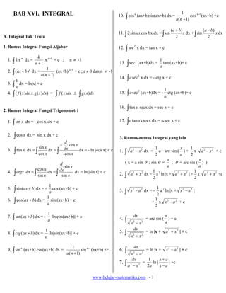Dokumen ini merangkum rumus-rumus integral, termasuk fungsi aljabar dan trigonometri, serta integral tertentu dan luas daerah antara kurva. Terdapat juga penjelasan mengenai volume benda putar. Rumus-rumus ini sangat berguna untuk menyelesaikan masalah kalkulus.