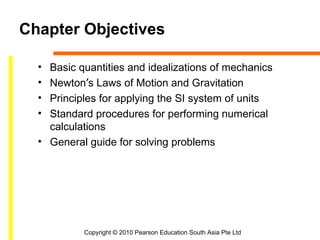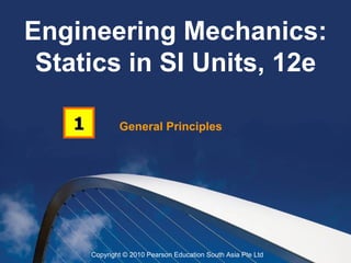 This document provides an overview of engineering mechanics and statics concepts. It discusses the three branches of mechanics, including rigid-body mechanics which deals with both statics and dynamics. The fundamentals of statics are presented, including basic quantities like length, mass and time. Newton's laws of motion and gravitational attraction are also covered. The document outlines the International System of Units and procedures for numerical calculations and general problem solving in mechanics.