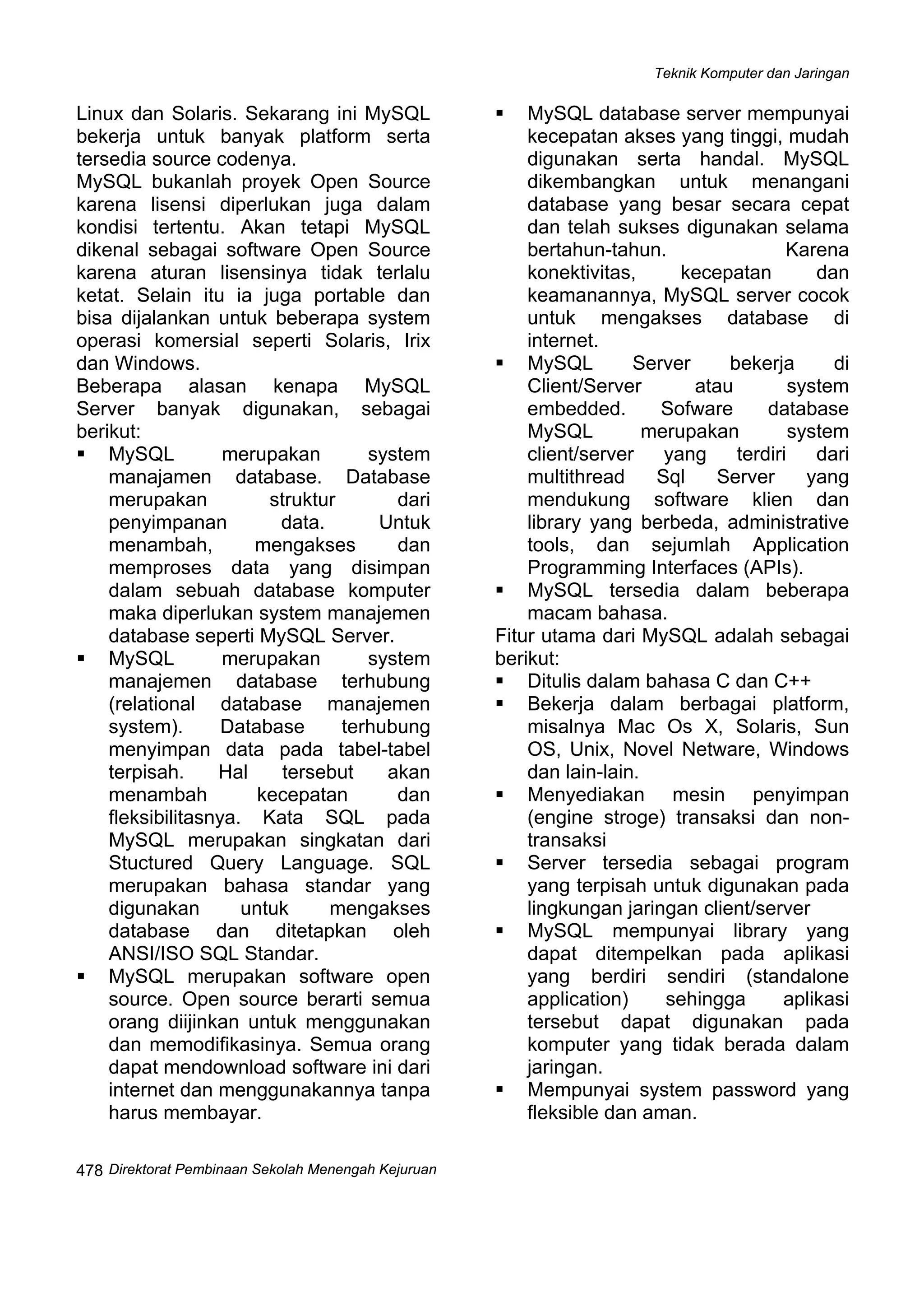 Dokumen tersebut membahas tentang instalasi dan penggunaan MySQL sebagai database server. Secara singkat, dibahas mengenai tujuan pembelajaran tentang database, komponen MySQL, kelebihan MySQL sebagai database server, format tabel yang didukung MySQL seperti MyISAM dan InnoDB, serta langkah-langkah instalasi MySQL di sistem operasi Windows dan Linux.