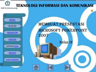 Dokumen ini menjelaskan langkah-langkah membuat presentasi menggunakan Microsoft PowerPoint 2007, termasuk pengenalan perangkat dan sistem presentasi. Materi mencakup cara membuat dokumen baru, mengganti layout, menggunakan tema, dan bekerja dengan teks serta gambar. Latihan soal remidi juga disertakan untuk menguji pemahaman mengenai aplikasi tersebut.