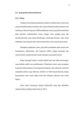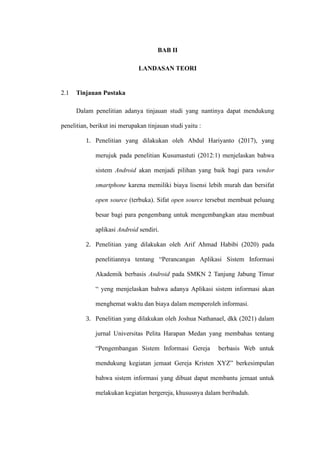 Dokumen ini membahas tentang sistem informasi, termasuk definisi, komponen, dan peranannya dalam organisasi. Juga disebutkan tentang liturgi dalam ibadah gereja dan sejarah Gereja Kristen Sumatera Bagian Selatan (GKSBS) serta perkembangan sistem operasi Android. Penelitian terkait sistem informasi dan aplikasinya di berbagai konteks juga dijelaskan.