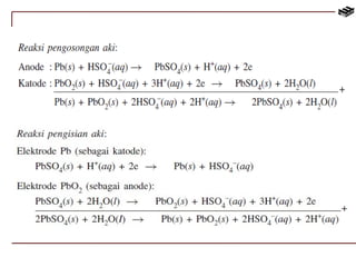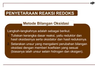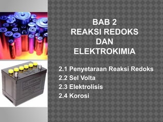 Dokumen tersebut membahas tentang reaksi redoks dan elektrokimia, termasuk penyetaraan reaksi redoks, sel volta, elektrolisis, dan korosi. Secara khusus membahas metode penyetaraan reaksi redoks, susunan sel volta, potensial elektrode standar, dan hukum-hukum Faraday yang terkait dengan elektrolisis.