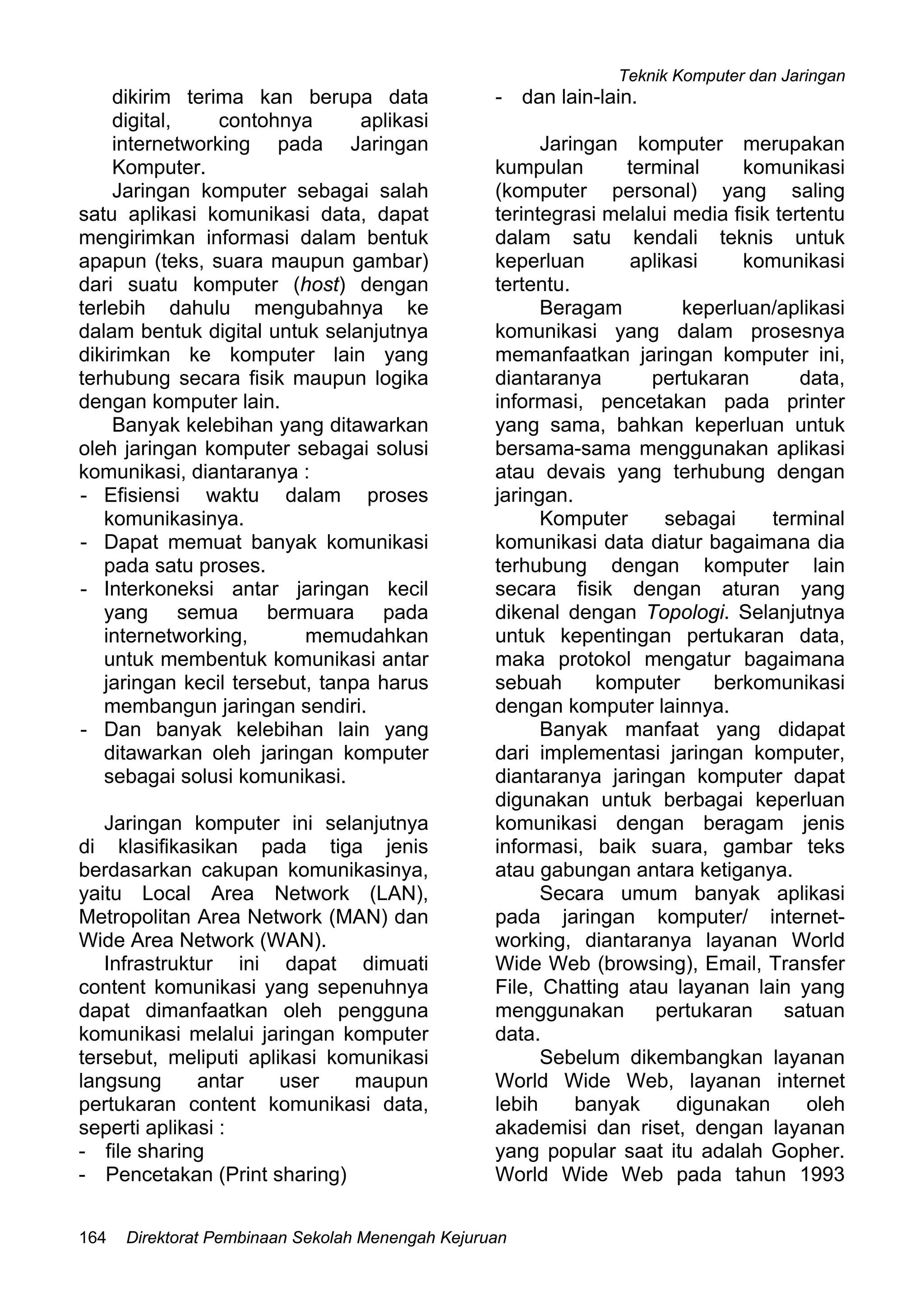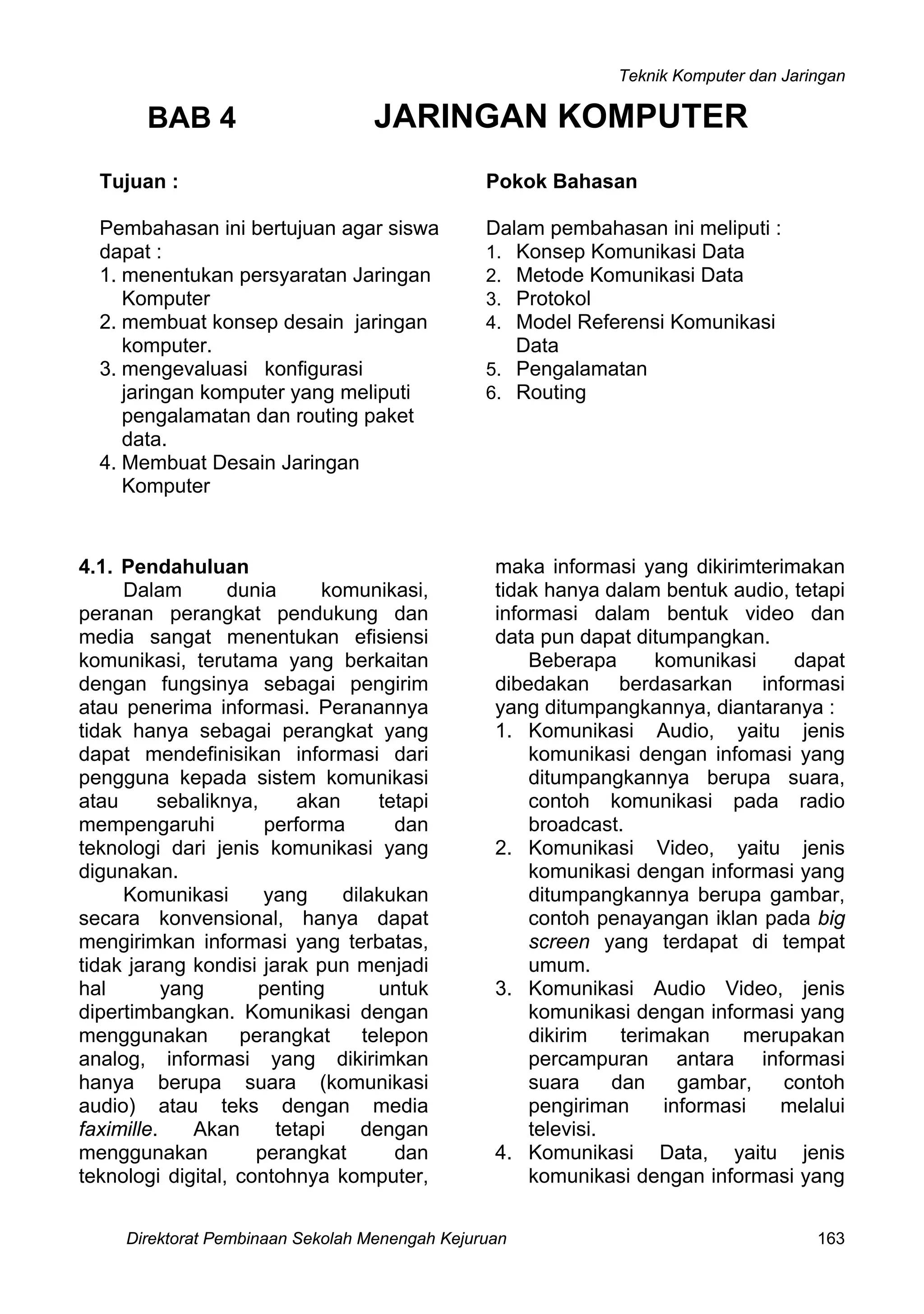 Dokumen ini menjelaskan tentang teknik komputer dan jaringan serta tujuan pembelajaran bagi siswa, termasuk menentukan persyaratan jaringan, merancang, dan mengevaluasi jaringan komputer. Terdapat juga penjelasan mengenai berbagai metode komunikasi data, protokol, dan manfaat jaringan komputer dalam kehidupan sehari-hari, serta perkembangan layanan internet dan komunikasi digital. Selain itu, dijelaskan mengenai komponen komunikasi data, cara kerja serta pengendalian aliran informasi dalam jaringan.