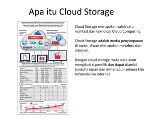 Dokumen tersebut membahas tentang Cloud Storage, yaitu media penyimpanan data di internet yang memungkinkan pengguna mengakses dan berbagi file dari berbagai perangkat melalui koneksi internet. Cloud Storage memiliki beberapa manfaat seperti kolaborasi, backup data, dan berbagi file secara otomatis.
