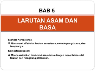 Bab 5 membahas larutan asam dan basa, termasuk konsep asam dan basa menurut teori Arrhenius, Brønsted-Lowry, dan Lewis. Terdapat penjelasan tentang sifat larutan asam dan basa, pengukuran pH, derajat ionisasi, tetapan ionisasi, dan reaksi antara asam dan basa.