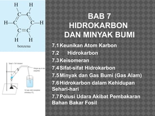 BAB 7 membahas tentang hidrokarbon dan minyak bumi. Termasuk karakteristik atom karbon, jenis-jenis hidrokarbon seperti alkana, alkena, dan alkuna beserta sifat dan reaksinya. Juga dibahas tentang proses pembentukan minyak bumi, pengeborannya, dan fraksi hasil penyulingan. Diakhiri dengan penggunaan hidrokarbon dalam kehidupan sehari-hari dan masalah polusi udara akibat pembakaran b