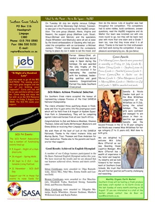 This newsletter provides updates from Southern Cross Schools in Hoedspruit, South Africa. It discusses progress made on new sports fields, with clearing of trees and bushes completed and earth moving started. It highlights two grade 7 students who participated in a regional science fair, with one receiving a silver certificate and the other a gold certificate. It also summarizes a hip hop competition that 10 college students took part in, getting knocked out in the later rounds. The newsletter promotes an upcoming fundraiser auction and recognizes students who received green awards for environmental efforts.