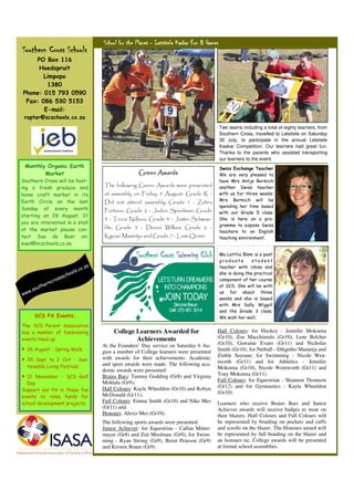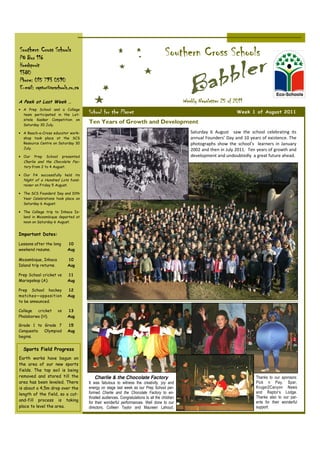 This newsletter provides updates from Southern Cross Schools, including information about recent and upcoming events. It discusses the school's 10th anniversary celebration held on August 6th, which included looking back at photographs from 2002 and 2011. It also previews upcoming sports matches and academic competitions. Additionally, it provides details about the progress being made on new sports fields and recognizes students who received academic and athletic awards at the anniversary ceremony.