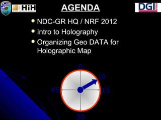 The document discusses creating holographic photomaps from satellite images. It begins with an introduction to the NATO Response Force (NRF) and NRF 2012, where the NDC-GR HQ is located. It then provides an introduction to holography and the process for organizing geospatial data to create a holographic map. This involves acquiring DEM and satellite imagery data, co-registering and importing it into 3D software, generating terrain, overlaying image and additional data layers, setting up a virtual camera, rendering views, and inputting the views into a digital holographic printer to create the final hologram. An example area along the Evros River is used. Potential next