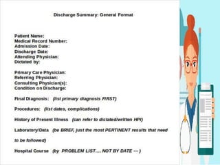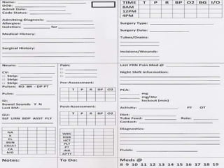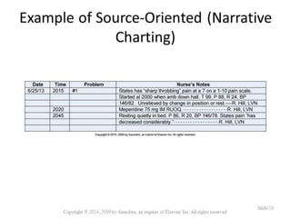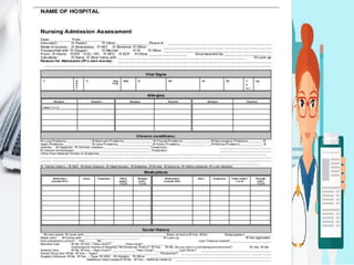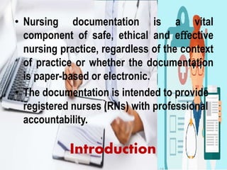 The document outlines the importance of nursing documentation as a critical aspect of healthcare, emphasizing its role in communication, legal accountability, and care planning. Effective documentation practices include maintaining factual, accurate, and concise records while adhering to legal standards and confidentiality. It also covers various types of records and forms used in healthcare settings, highlighting the transition to computerized documentation and its benefits and challenges.