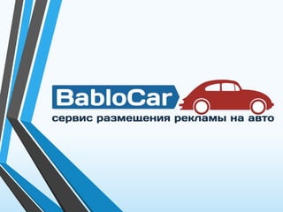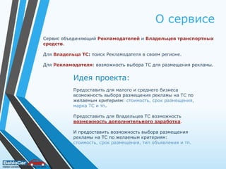 Документ описывает сервис, который соединяет рекламодателей и владельцев транспортных средств для размещения рекламы. Он предлагает владельцам ТС возможность заработать дополнительный доход, а рекламодателям — оптимизировать расходы на рекламу через выбор автомобилей по критериям. Целевая аудитория включает малый и средний бизнес, а также владельцев легковых и грузовых автомобилей.