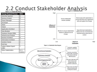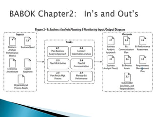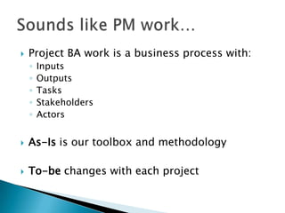 The document discusses planning for business analysis activities on projects. It addresses:
