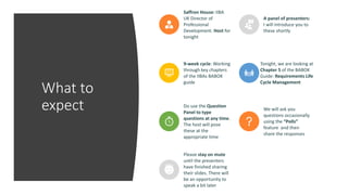 This document summarizes an online study group session for the IIBA UK BABOK guide. The session will cover Chapter 5 on Requirements Life Cycle Management and include presentations from Saffron House, the IIBA UK Director of Professional Development, and two IIBA UK volunteers. Participants will work through the key chapters of the BABOK guide over nine weeks and are encouraged to ask questions during the session. The session will also include polls to engage participants.