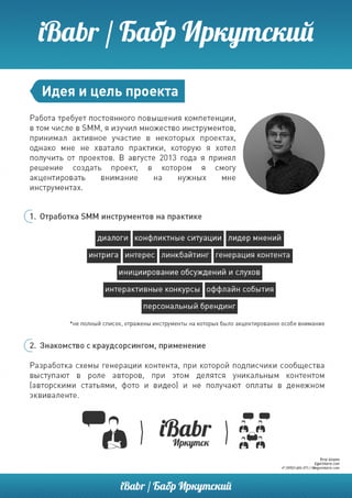 Документ описывает проект 'babr/бабриркутски', направленный на создание онлайн-сообщества в Иркутске с использованием краудсорсинга для генерации контента. Основные цели проекта включают привлечение внимания к местным событиям и создание образа лидеров мнений в сознании целевой аудитории. Проект был успешно реализован с минимальными затратами и привлек более 15000 жителей Иркутска.