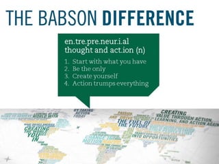 The document outlines the blended learning MBA program at Babson, which combines online and in-person sessions over a 21-month period, emphasizing flexible formats that accommodate both professional and personal demands. It details the core curriculum and signature learning experiences designed to deepen knowledge and practical application through projects and consulting experiences. The program also includes a robust career development support system for students to enhance their professional opportunities.