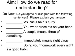 The document provides guidance on how to read for understanding by having students do a "Do Now" activity to agree or disagree with sample sentences, then work with a partner to identify the main idea and supporting ideas of a passage, and finally answer vocabulary questions about understanding cause and effect and summaries.