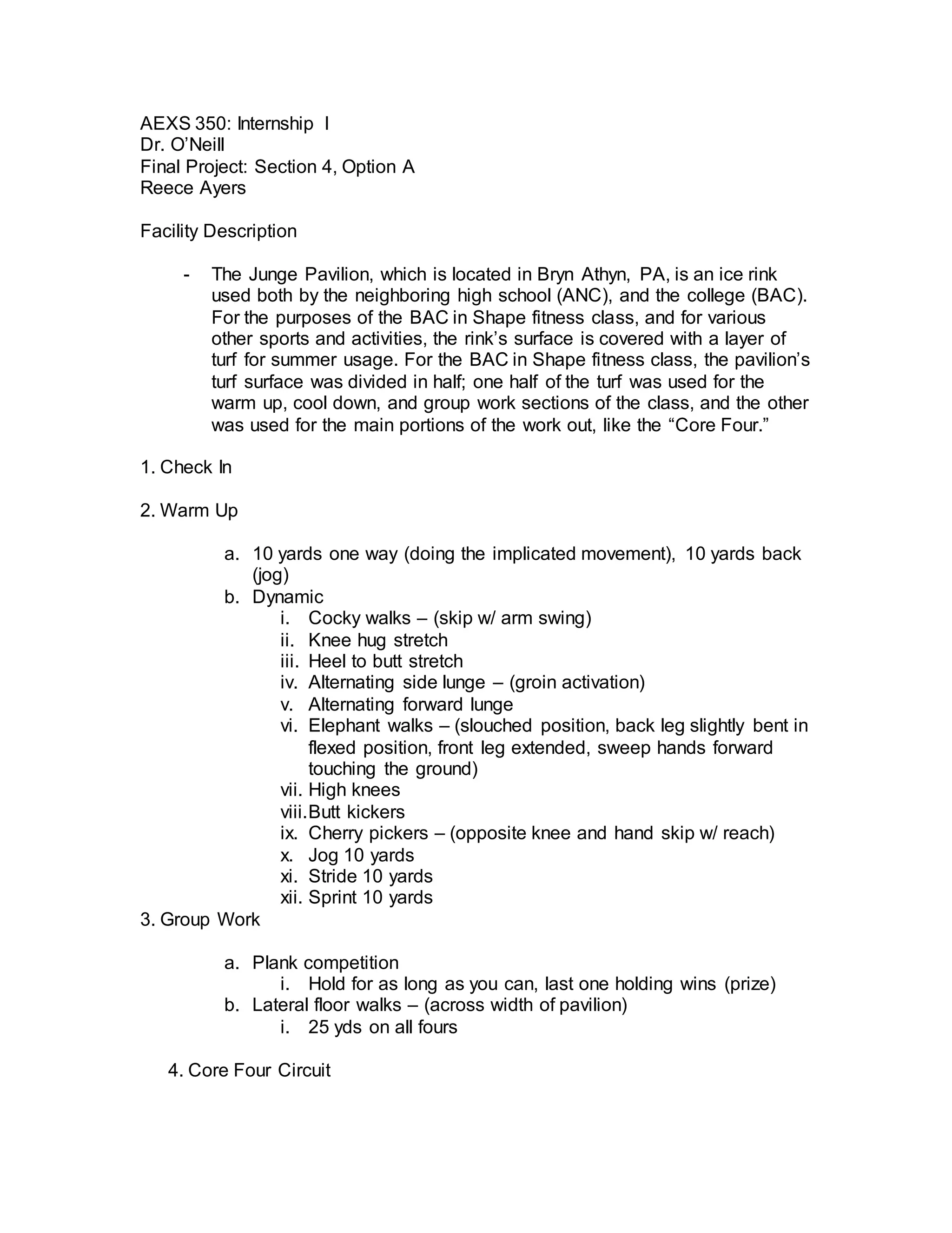 The Junge Pavilion is an ice rink in Bryn Athyn, PA that is used by a local high school and college. For a college fitness class and other activities, the ice rink surface is covered with artificial turf. The turf area is divided in half, with one side for warmups and the other for circuit training exercises called the "Core Four." The Core Four circuit consists of four stations spaced around the turf, each performed for one minute before moving to the next station with a 20 second transition exercise like planks. Examples of the stations are exercises with a physioball, lunges, mountain climbers, and medicine ball slams. The class also includes group exercises like speed ladder drills and