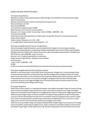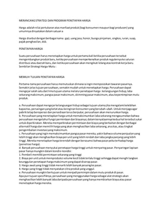 Penetapan harga merupakan strategi penting bagi perusahaan. Terdapat berbagai metode penetapan harga seperti penetapan harga berdasarkan biaya, permintaan, sasaran pengembalian, dan nilai yang dipersepsikan pelanggan. Perusahaan perlu memilih tujuan dan metode penetapan harga yang tepat serta mempertimbangkan berbagai faktor seperti pesaing, distribusi, dan regulasi pemerintah. Strategi adaptasi harga meliputi diskon, potongan,